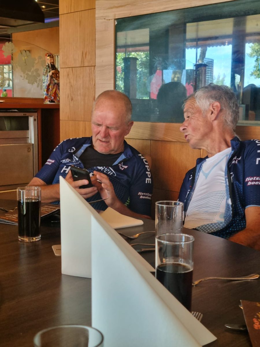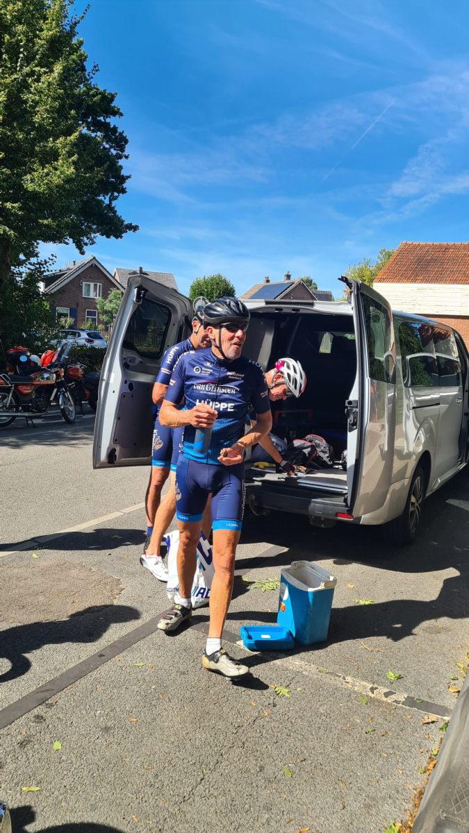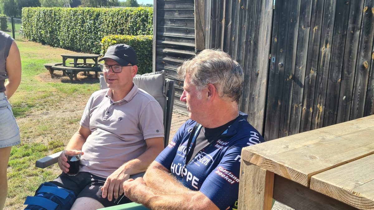 Daar wachtte ons een banaan en een suikerhoudende versnapering, terwijl de sfeer werd verhoogd door een gezellige ontmoeting met een club oude brommerrijders.