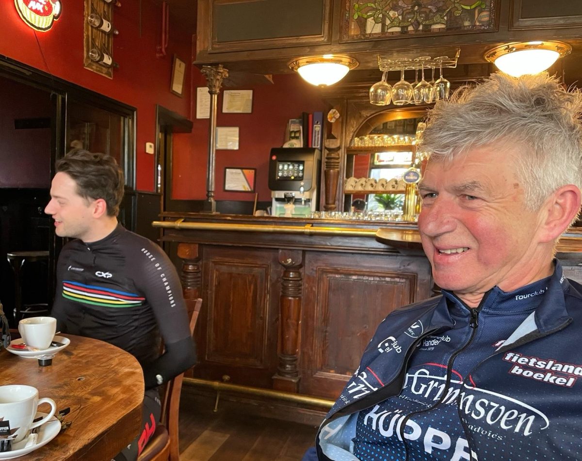 Na zo’n 50 km kwamen we aan bij de pauzeplek. Daar gingen nog twee renners huiswaarts, ook zij moesten eerder thuis zijn. De rest genoot van een lekker bakkie ☕ én van de vrachtwagenparade die voorbij kwam.